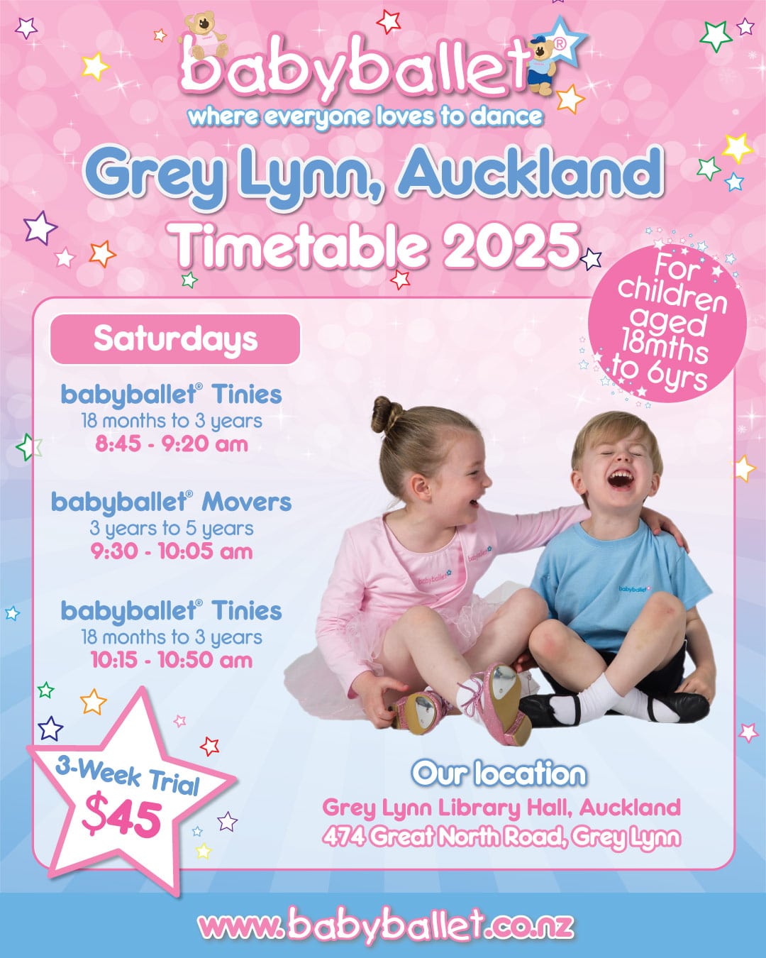 We run babyballet® classes for babies, toddlers, preschoolers and school starters alike at our dance studio in Grey Lynn, Auckland. So if you live in the area, please take a look at our timetable  – which is quick and easy to use – and see if you can find a suitable day and time for you and your little one.